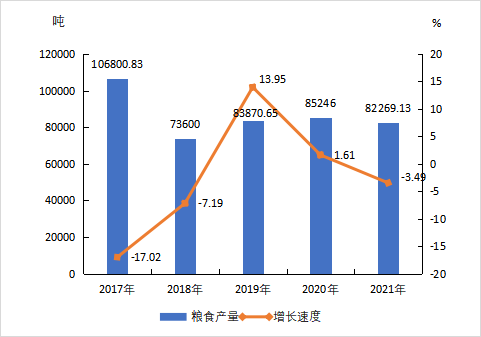 图2 2017年—2021年全县粮食产量及其增长速度