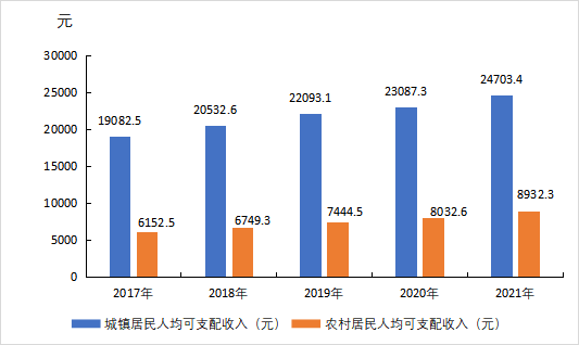 图5 2017年—2021年全县城乡居民人均可支配收入