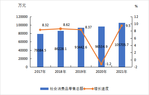 图3 2017年—2021年全县社会消费品零售总额及其增长速度