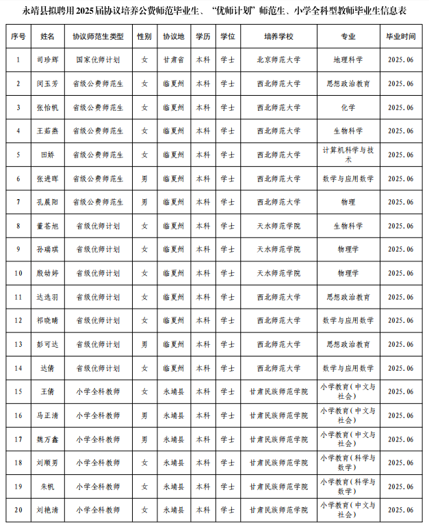根据《甘肃省教育厅 甘肃省财政厅 甘肃省人力资源和社会保障厅 中共甘肃省委机构编制委员会办公室关于印发甘肃省省属师范类本科院校公费教育实施办法(试行)的通知》(甘教厅〔2020〕5号)、《甘肃省教育厅等九部门关于印发甘肃省实施<中西部欠发达地区优秀教师定向培养计划>工作方案的通知》(甘教师〔2022〕1号)、《甘肃省教育厅等四部门关于印发甘肃省乡村小学全科型教师培养培训工作方案》(甘教师〔2021〕4号)等文件精神,经资格审核、综合考察、体检等环节,司珍辉等20名2025届协议培养公费师范毕业生、“优师计划”师范生与小学全科型教师毕业生符合聘用条件,拟聘用至永靖县中小学工作。现将拟聘人员信息公示如下,公示期为2025年8月12日-8月16日。监督电话:0930-8832243(工作日上午8∶30-12∶00,下午14∶30-18∶00)