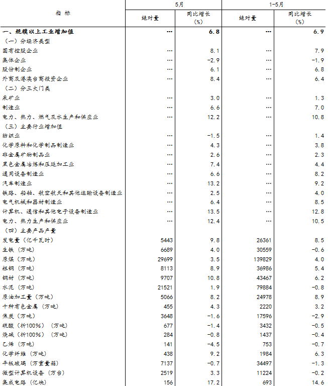 5月份,全国规模以上工业增加值同比实际增长6.8%,增速比上月回落0.2个百分点,比上年同月加快0.3个百分点。分经济类型看,国有控股企业增加值同比增长8.1%,集体企业下降2.9%,股份制企业增长6.1%,外商及港澳台商投资企业增长8.4%。分三大门类看,采矿业增加值同比增长3.0%,制造业增长6.6%,电力、热力、燃气及水生产和供应业增长12.2%。1-5月份,全国规模以上工业增加值同比增长6.9%,增速与1-4月份持平。