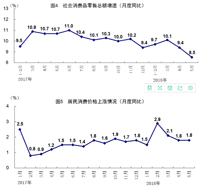 5月份,全国居民消费价格同比上涨1.8%,涨幅与上月持平,环比下降0.2%。分类别看,食品烟酒价格同比上涨0.7%,衣着上涨1.1%,居住上涨2.2%,生活用品及服务上涨1.5%,交通和通信上涨1.8%,教育文化和娱乐上涨1.9%,医疗保健上涨5.1%,其他用品和服务上涨1.0%。1-5月份,全国居民消费价格同比上涨2.0%。5月份,全国工业生产者出厂价格同比上涨4.1%,涨幅比上月扩大0.7个百分点,环比上涨0.4%;全国工业生产者购进价格同比上涨4.3%,环比上涨0.3%。1-5月份,全国工业生产者出厂价格同比上涨3.7%,全国工业生产者购进价格同比上涨4.2%。