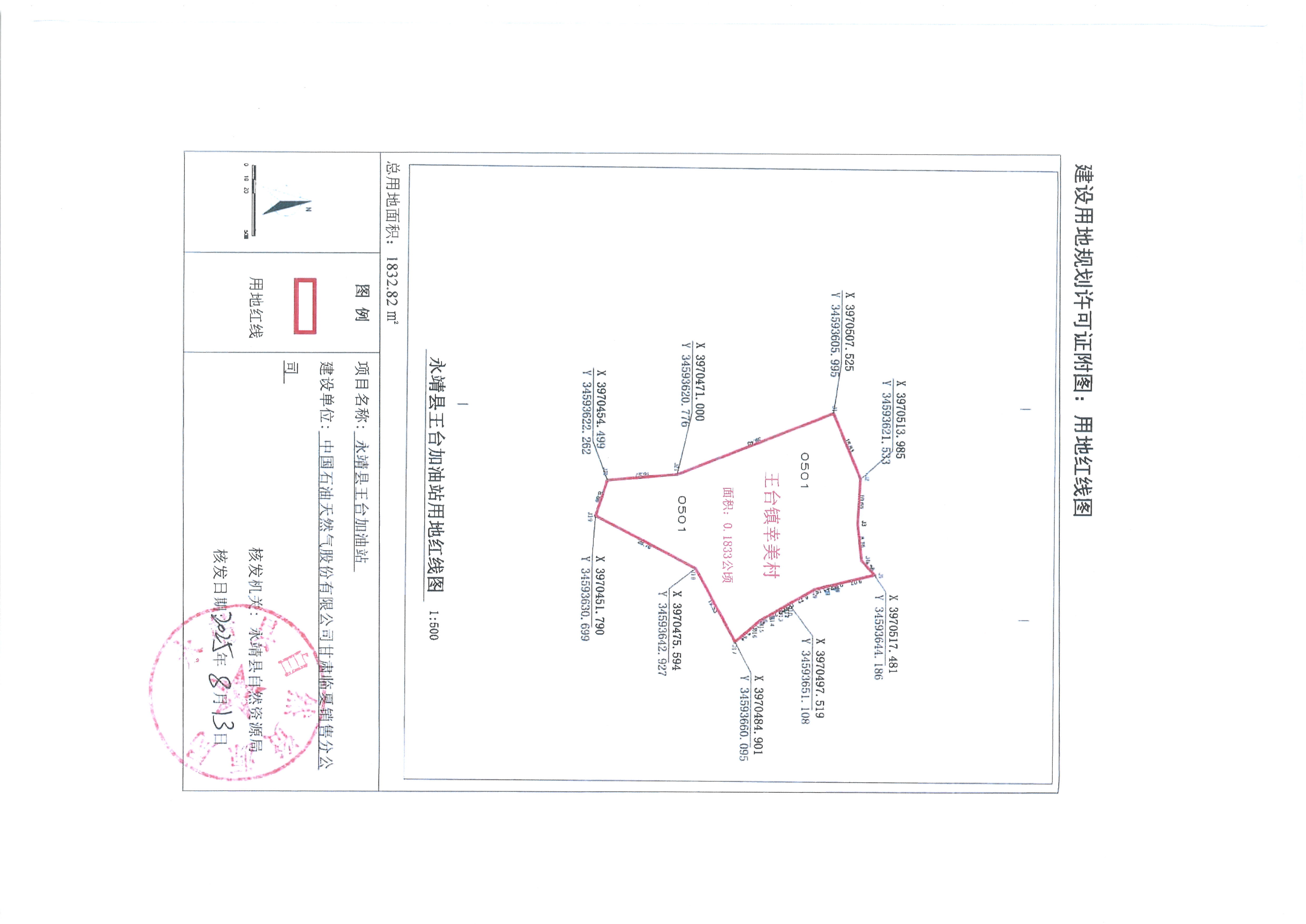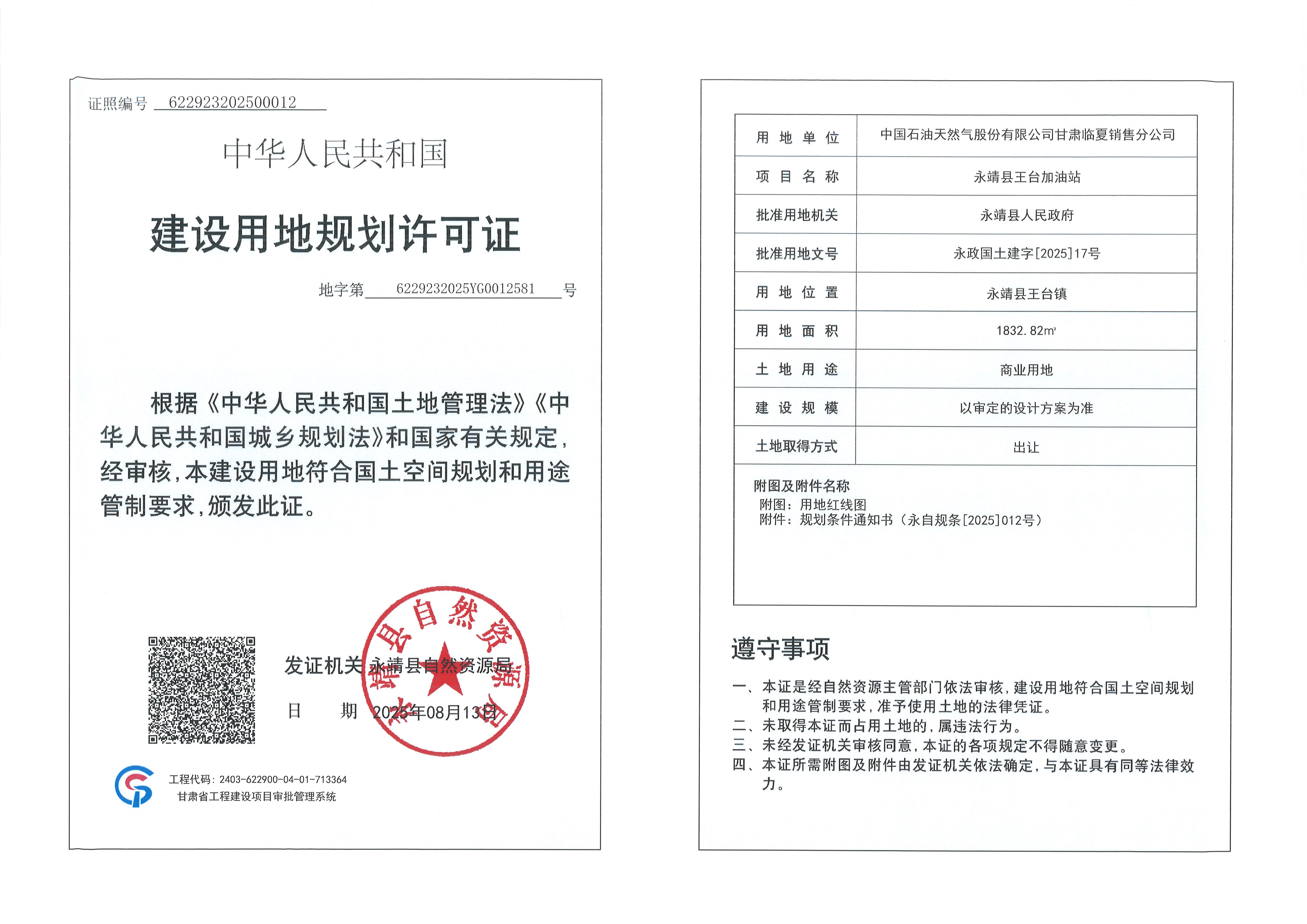 中国石油天然气股份有限公司甘肃临夏销售分公司向我局申请办理永靖县王台加油站项目建设用地规划许可证,我局按程序对申报材料进行了审核并做出予以办理的决定,现依据《中华人民共和国行政许可法》《中华人民共和国城乡规划法》《自然资源领域基层政务公开标准指引》等相关法律规定,对许可证证载内容进行公布: