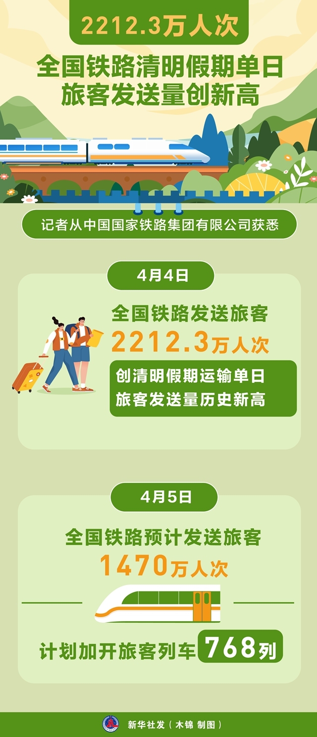 记者从中国国家铁路集团有限公司获悉,4月4日,全国铁路发送旅客2212.3万人次,创清明假期运输单日旅客发送量历史新高。4月5日,全国铁路预计发送旅客1470万人次,计划加开旅客列车768列。