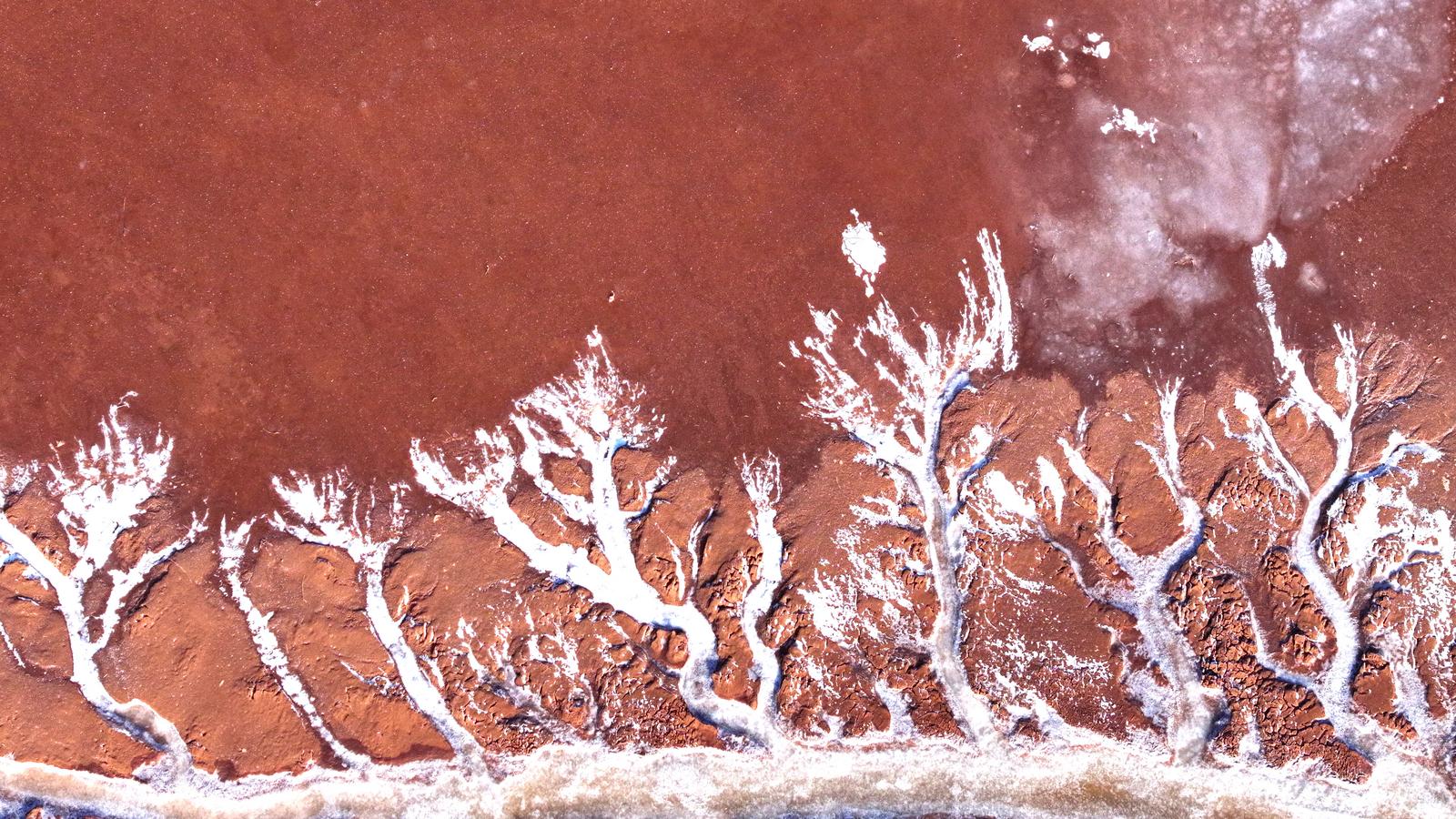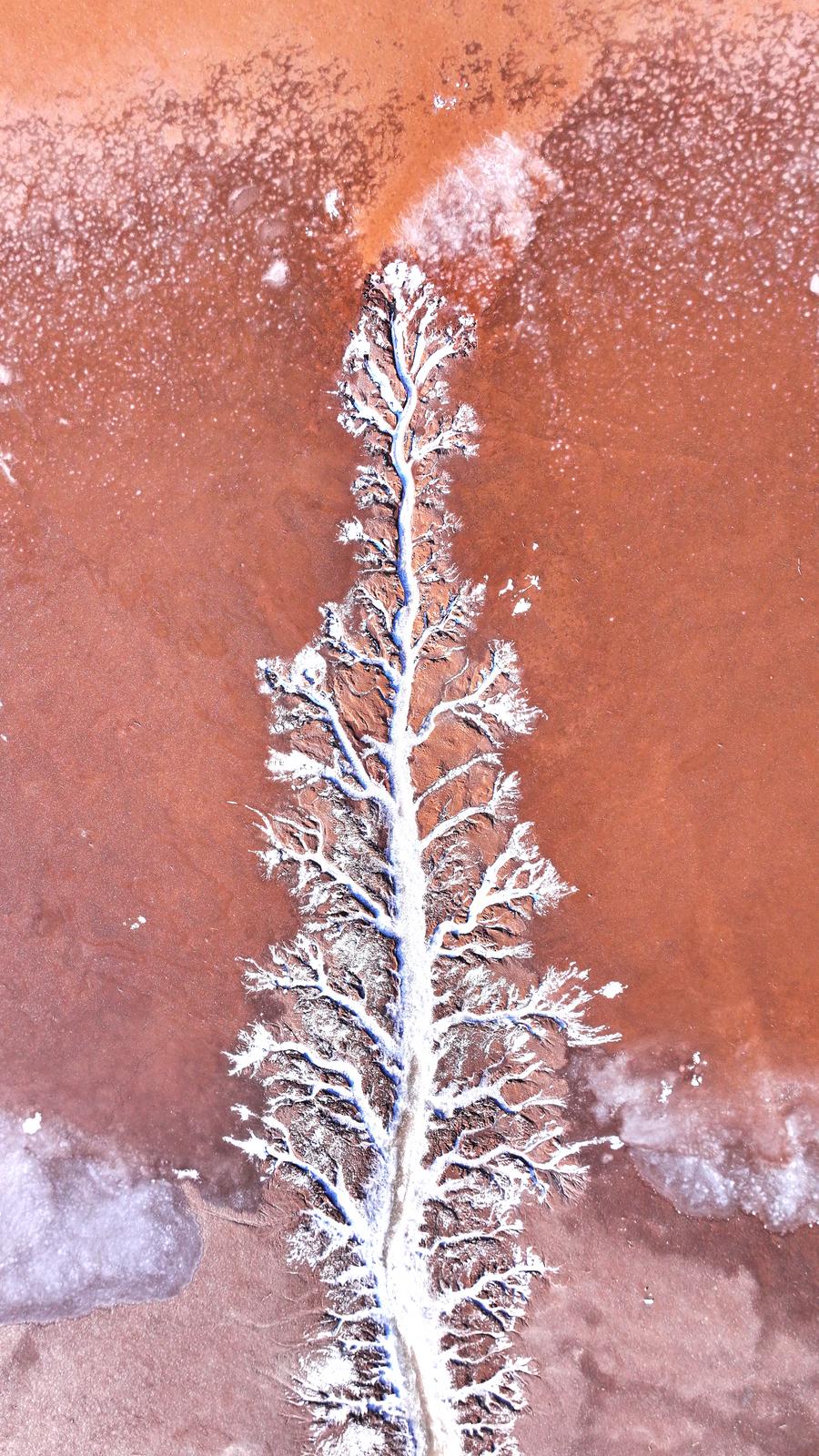 初雪后的晴天,站在高处远眺,这幅画卷便更加完整。“树”上开满了白色的花朵,印在红褐色的河床上。它靜止著,充滿了动态的幻觉,彷彿河水刚刚抽身,花树邹然绽放,那磅礴的生命力却被瞬間凝固在此刻。阳光斜射时,沟壑的阴影拉得很长,这“树”便有了深邃的立体感,像大地的掌文,也像时间在这里留下的记忆。
