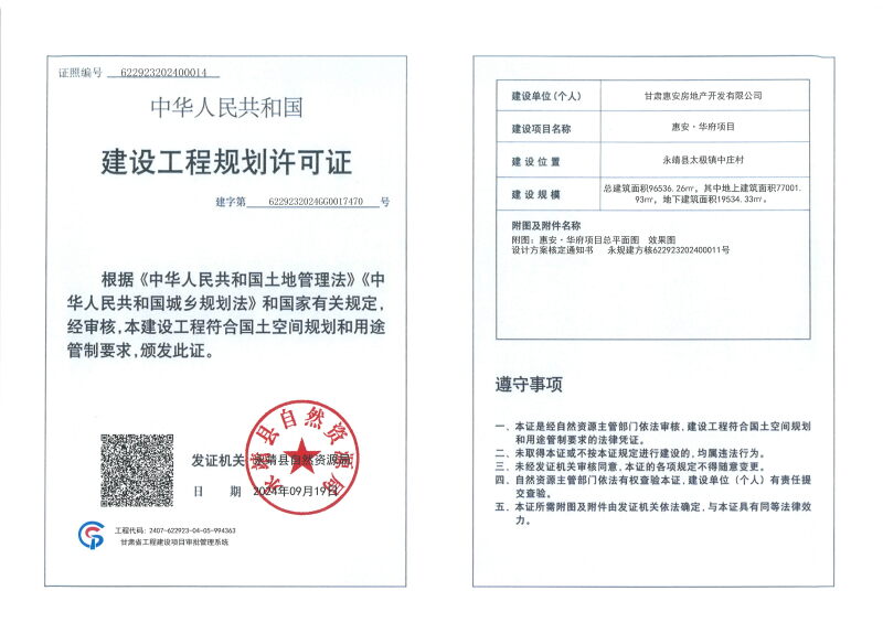 甘肃惠安房地产开发有限公司向我局申请办理惠安•华府项目(变更)建设工程规划许可证,我局按程序对申报材料进行了审核并做出予以办理的决定,现依据《中华人民共和国行政许可法》《中华人民共和国城乡规划法》《自然资源领域基层政务公开标准指引》等相关法律规定,对许可证证载内容进行公布: