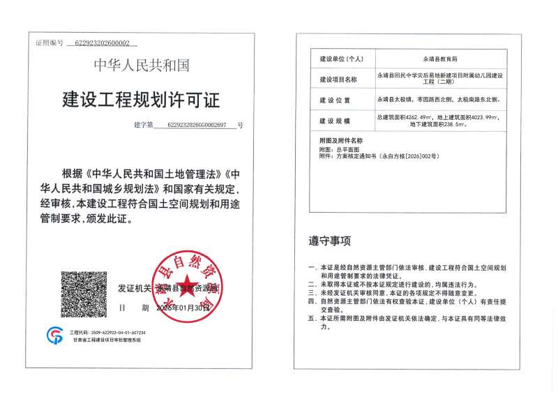 永靖县教育局向我局申请办理永靖县回民中学灾后易地新建项目附属幼儿园建设工程(二期)建设工程规划许可证,我局按程序对申报材料进行了审核并做出予以办理的决定,现依据《中华人民共和国行政许可法》《中华人民共和国城乡规划法》《自然资源领域基层政务公开标准指引》等相关法律规定,对许可证证载内容进行公布: