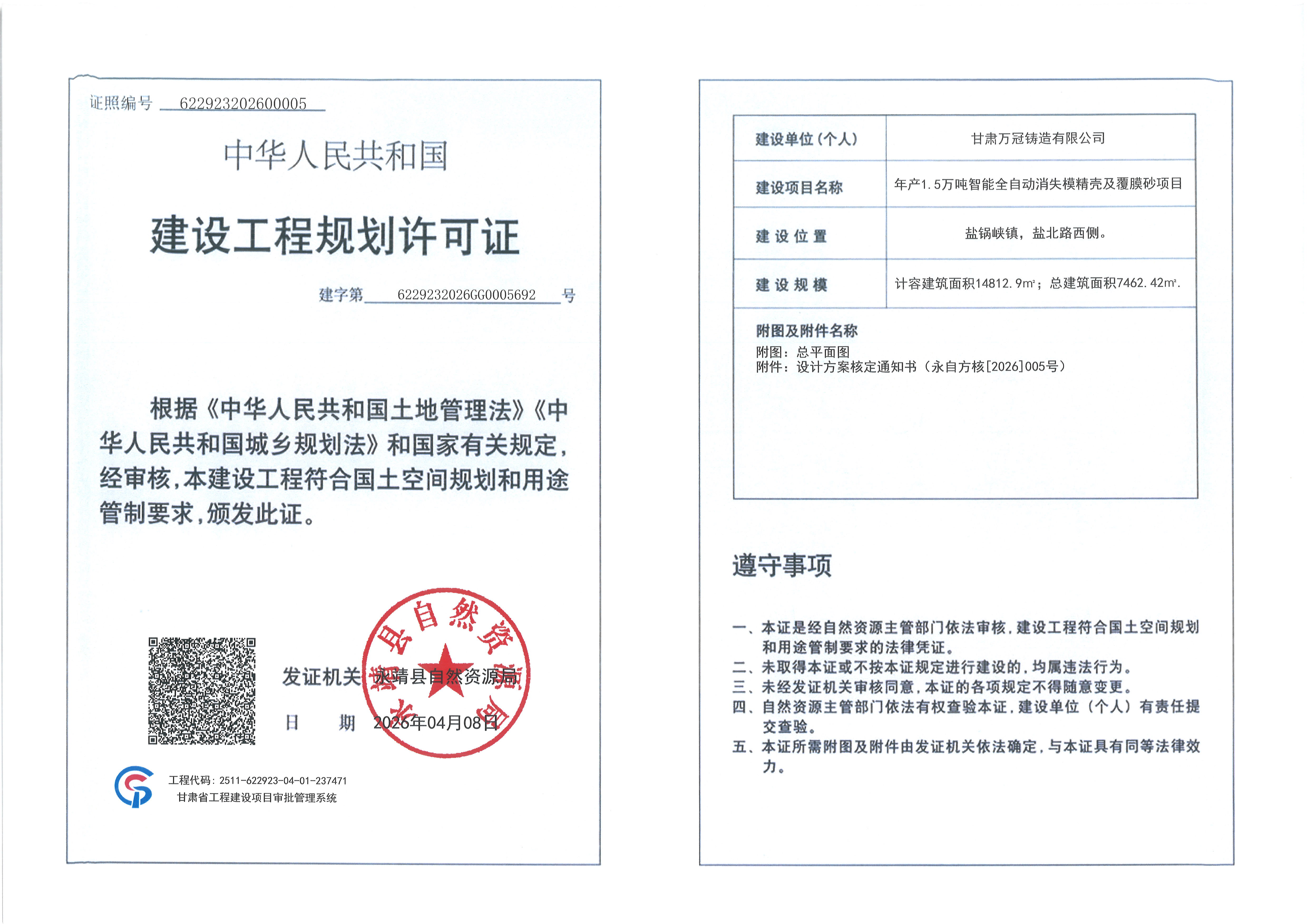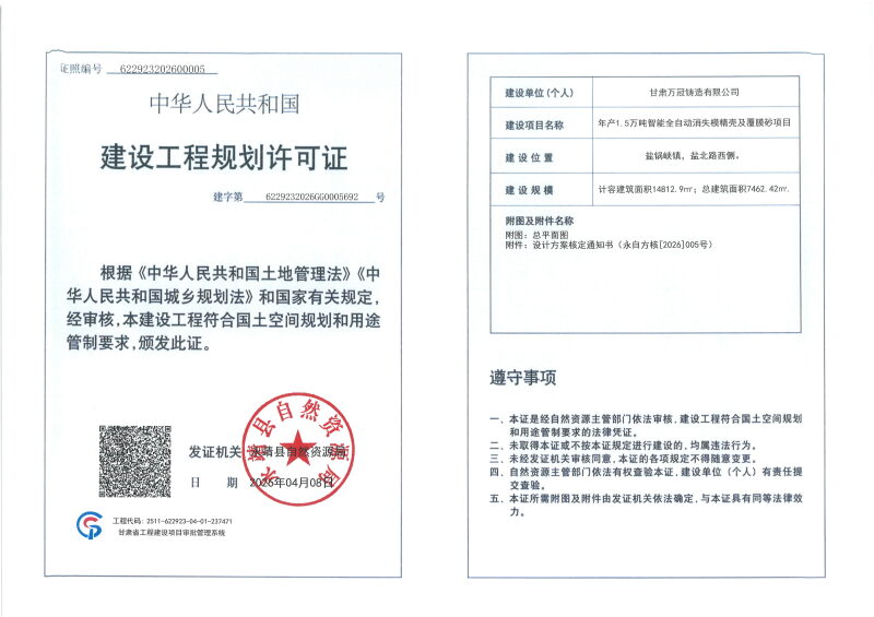 甘肃万冠铸造有限公司向我局申请办理年产1.5万吨智能全自动消失模精壳及覆膜砂项目建设工程规划许可证,我局按程序对申报材料进行了审核并做出予以办理的决定,现依据《中华人民共和国行政许可法》《中华人民共和国城乡规划法》《自然资源领域基层政务公开标准指引》等相关法律规定,对许可证证载内容进行公布: