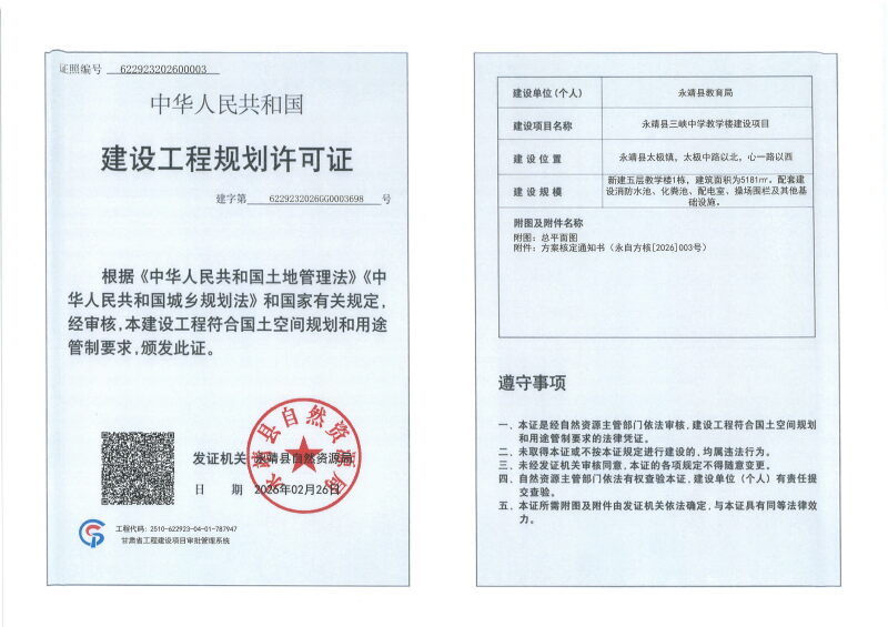 永靖县教育局向我局申请办理永靖县三峡中学教学楼建设项目建设工程规划许可证,我局按程序对申报材料进行了审核并做出予以办理的决定,现依据《中华人民共和国行政许可法》《中华人民共和国城乡规划法》《自然资源领域基层政务公开标准指引》等相关法律规定,对许可证证载内容进行公布: