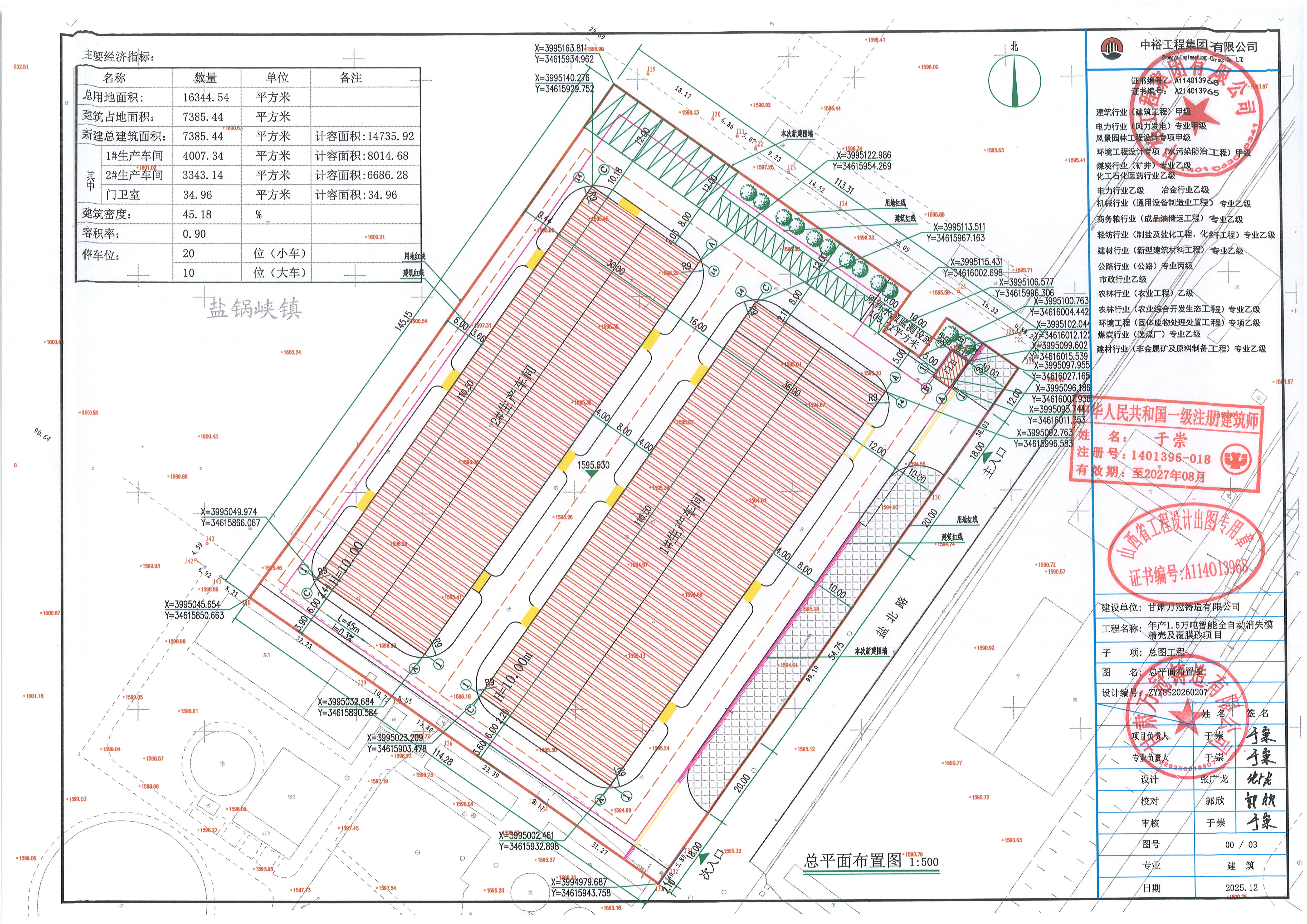 年产1.5万吨智能全自动消失模精壳及覆膜砂项目总用地面积16344.54㎡,总建筑面积7385.44㎡(计容面积14735.92㎡),容积率0.9,建筑密度45.18%,绿地率10%,停车位30辆(小车20辆、大车10辆)。