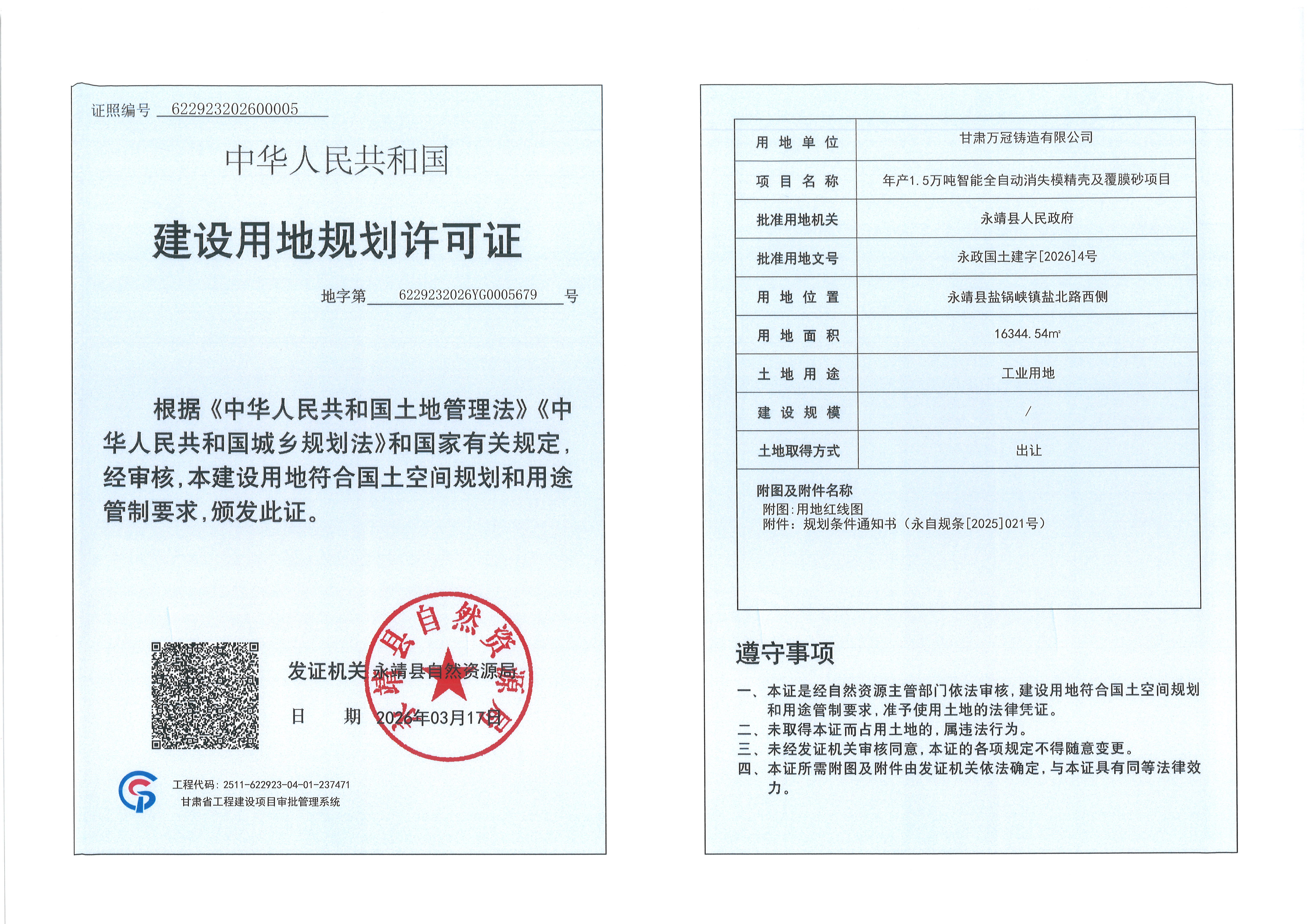 甘肃万冠铸造有限公司向我局申请办理年产1.5万吨智能全自动消失模精壳及覆膜砂项目建设用地规划许可证,我局按程序对申报材料进行了审核并做出予以办理的决定,现依据《行政许可法》《城乡规划法》《自然资源领域基层政务公开标准指引》等相关法律规定,对许可证证载内容进行公布: