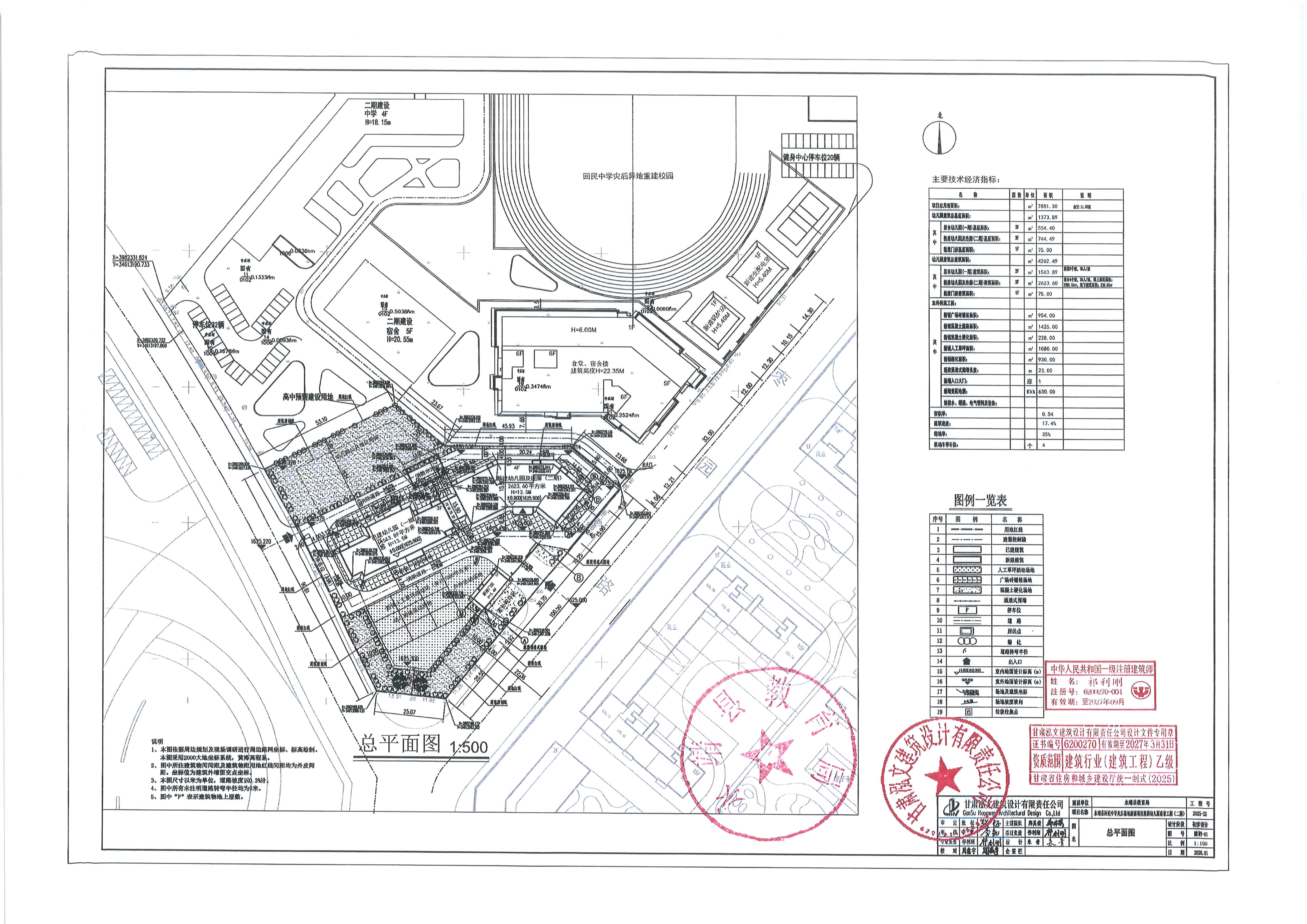 永靖县回民中学灾后易地新建项目附属幼儿园(二期)总用地面积7881.30㎡,总建筑面积4262.49㎡,容积率0.54,建筑密度17.4%,绿地率35%。