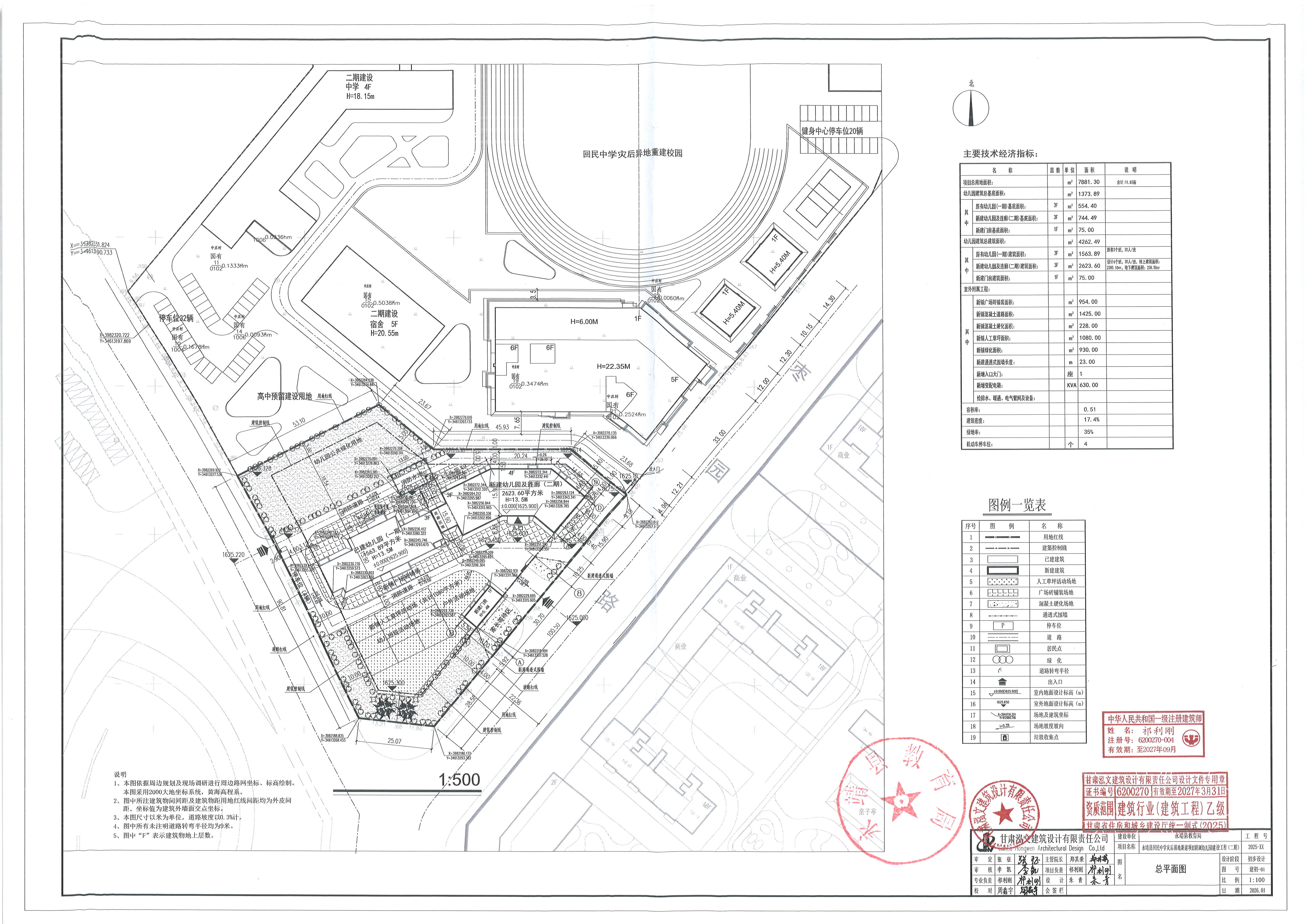 永靖县回民中学灾后易地新建项目附属幼儿园(二期)总用地面积7881.30㎡,总建筑面积4262.49㎡,容积率0.51,建筑密度17.4%,绿地率35%。
