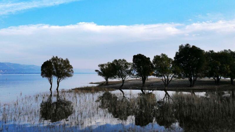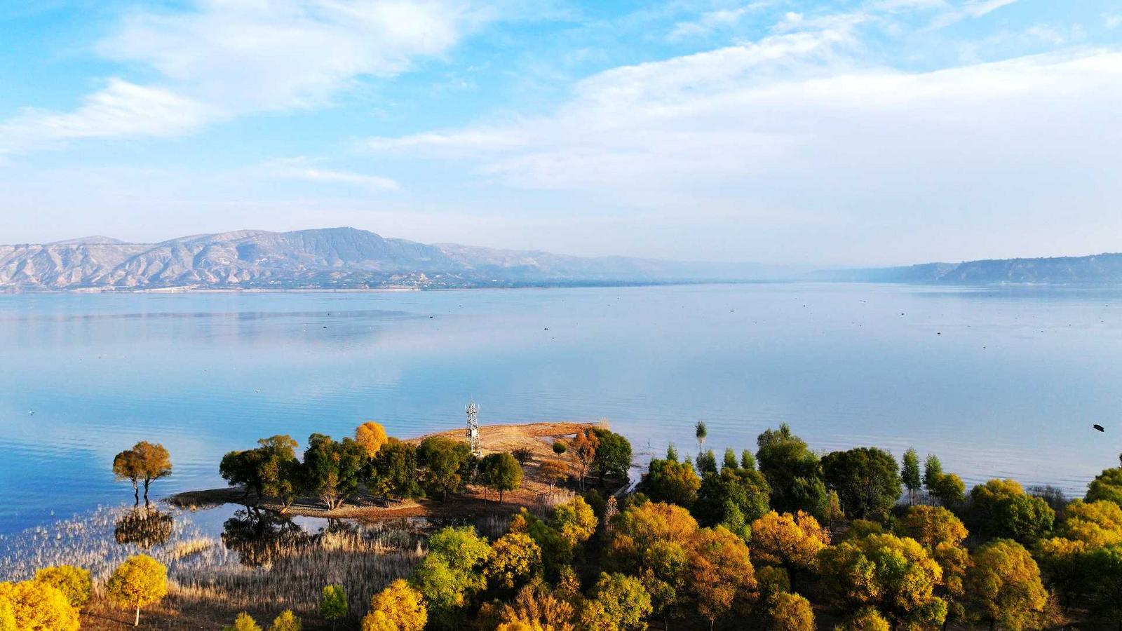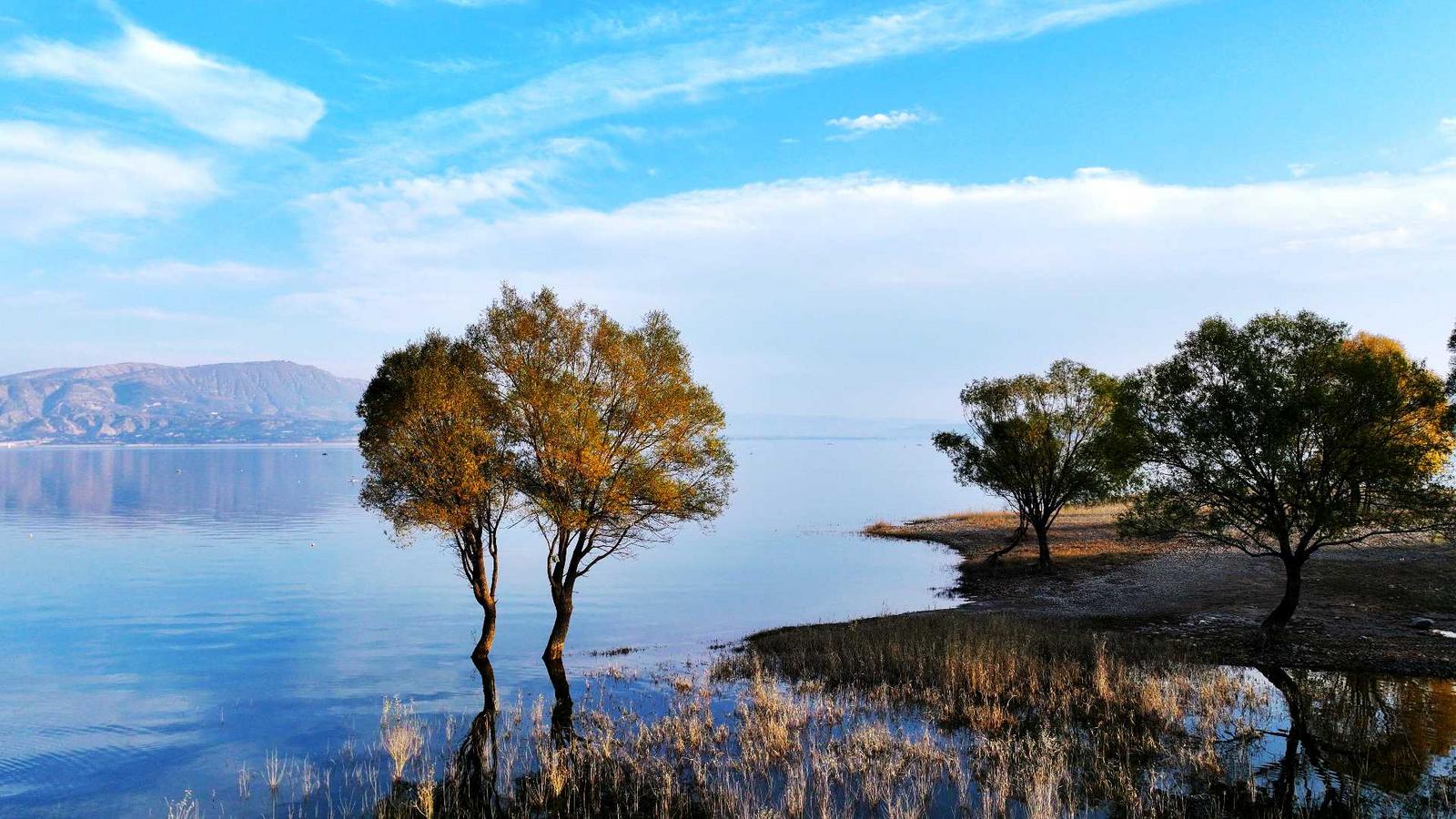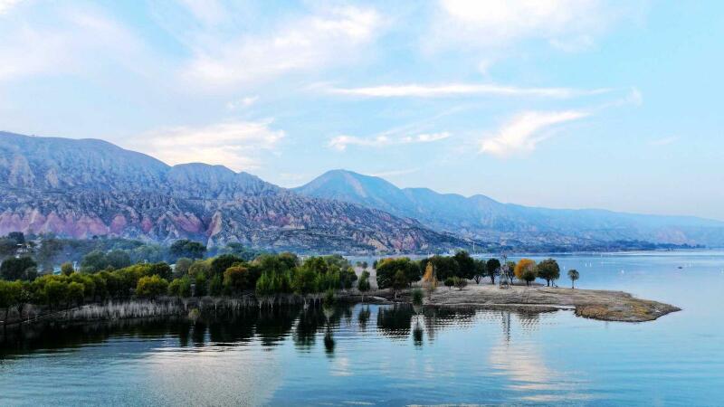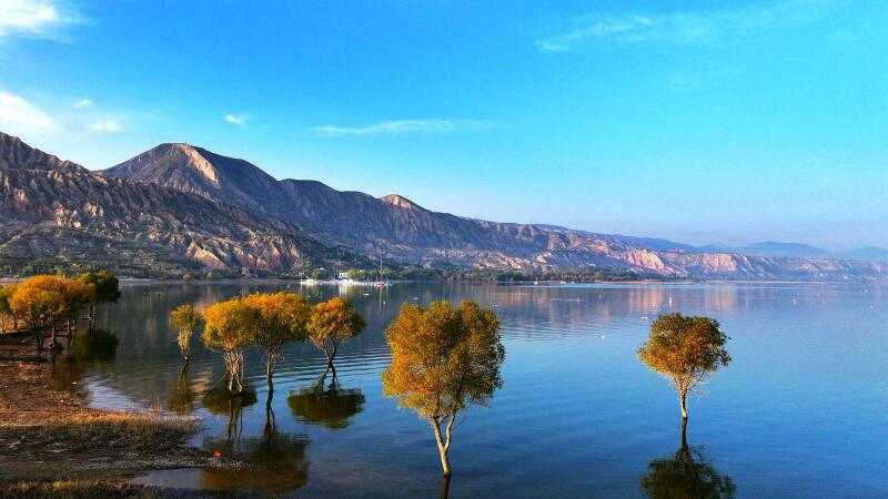 白日里,炳灵湖的颜色在阳光的映照下变幻莫测,时而金黄,时而湛蓝,与天空交相辉映。黄河岸边的树木正以最后的绚烂,装点着母亲河的壮丽画卷。