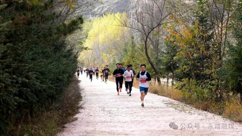 随着发令枪响,比赛正式拉开帷幕,选手们沿着6.6公里赛道奋勇前行,路线从炳灵龙谷山门出发,沿途赤壁丹崖与仿真恐龙景观交相辉映,层林尽染的秋景与山间清新空气相伴,选手们或结伴鼓劲、或稳步竞逐,途经补给站时补充能量,登顶后俯瞰山河全貌。