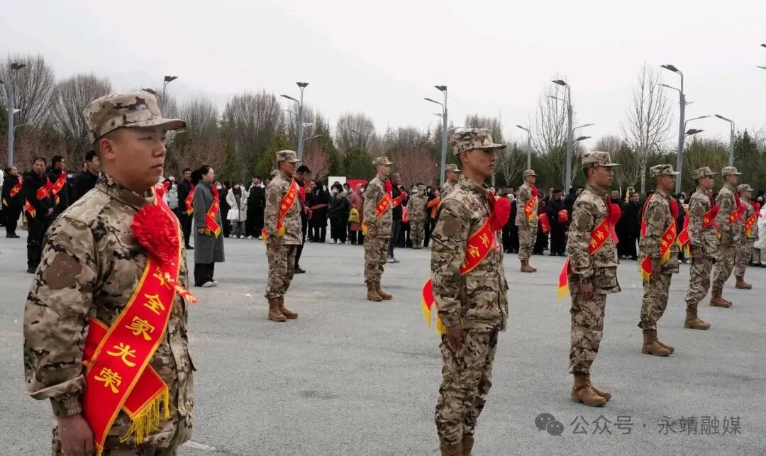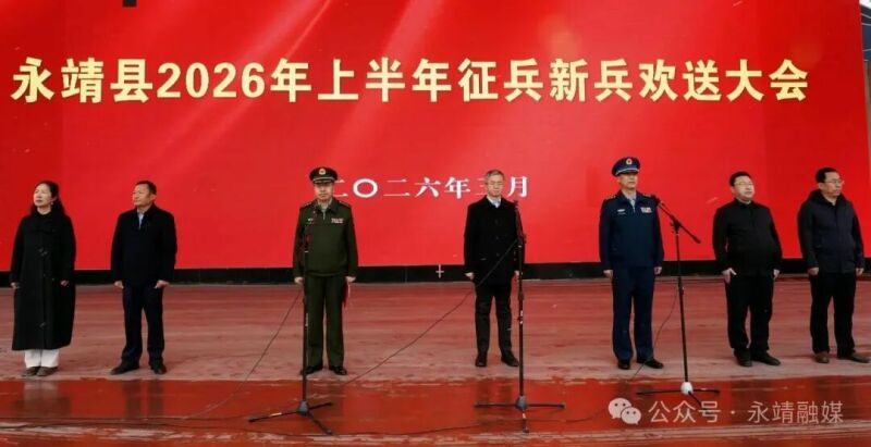 3月17日上午,永靖县2026年上半年新兵欢送大会在彩陶广场举行。县委常委、副县长赵俊岩,县委常委、县征兵和民兵工作机制常务副组长、人武部部长邹占强出席大会,县人武部政委张伟峰主持大会。县征兵办公室全体成员、全体专武干部参加活动,共同为14名即将奔赴军营的优秀青年送行。