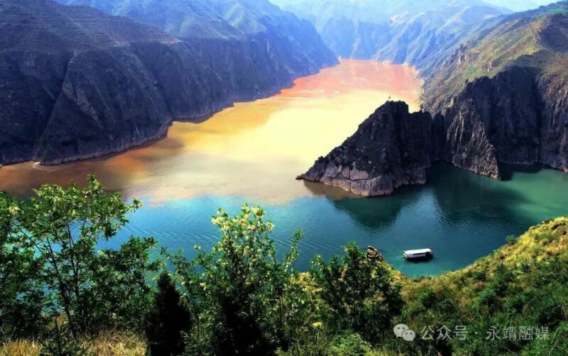 清澈的上游黄河水与较为浑浊的支流洮河就这样命运般地相遇了,以“人”字形在龙汇山前交汇,呈现出一面碧水,一面黄沙滔滔的有趣景象,它们轻盈碰撞撞,一清一浊,泾渭分明,宛若一个巨大的“鸳鸯锅”。