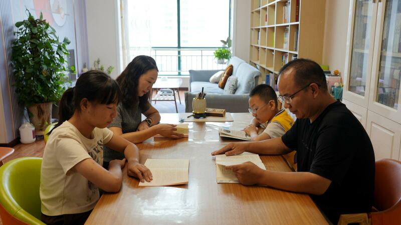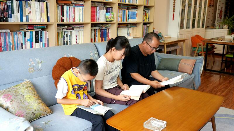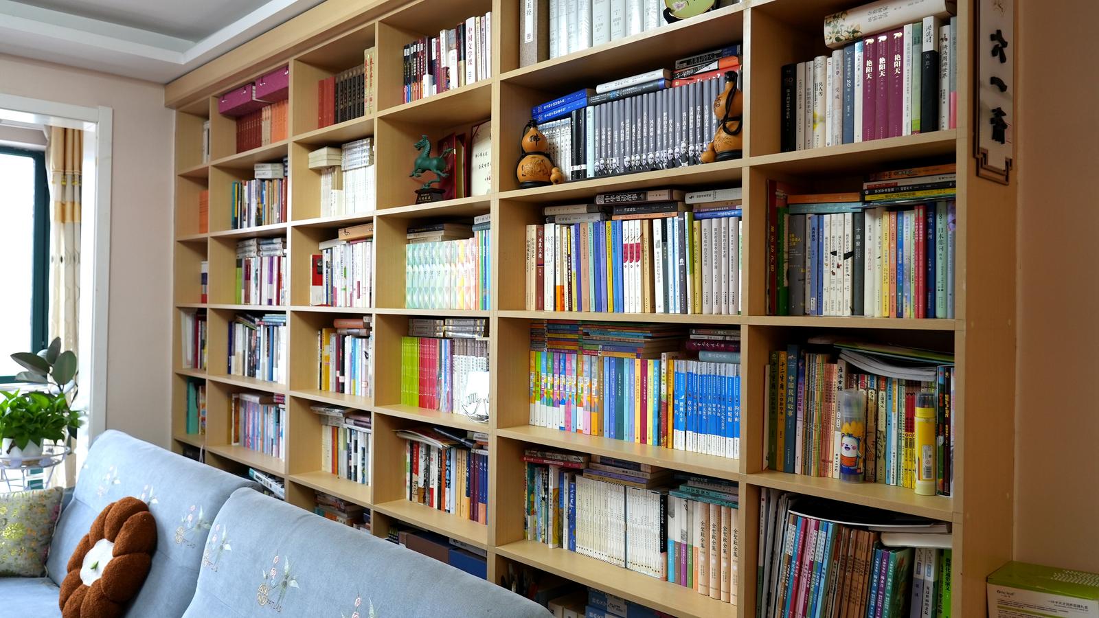 走进作家柳小瑛家的客厅,最醒目的不是超大屏幕的电视,而是占据整面墙的书架。上面整齐地分类陈列着文学、历史、科普、艺术等各类书籍,宛如一个温馨的家庭图书馆。一家四口在这里看书,构成了这个家庭最动人的日常画面。