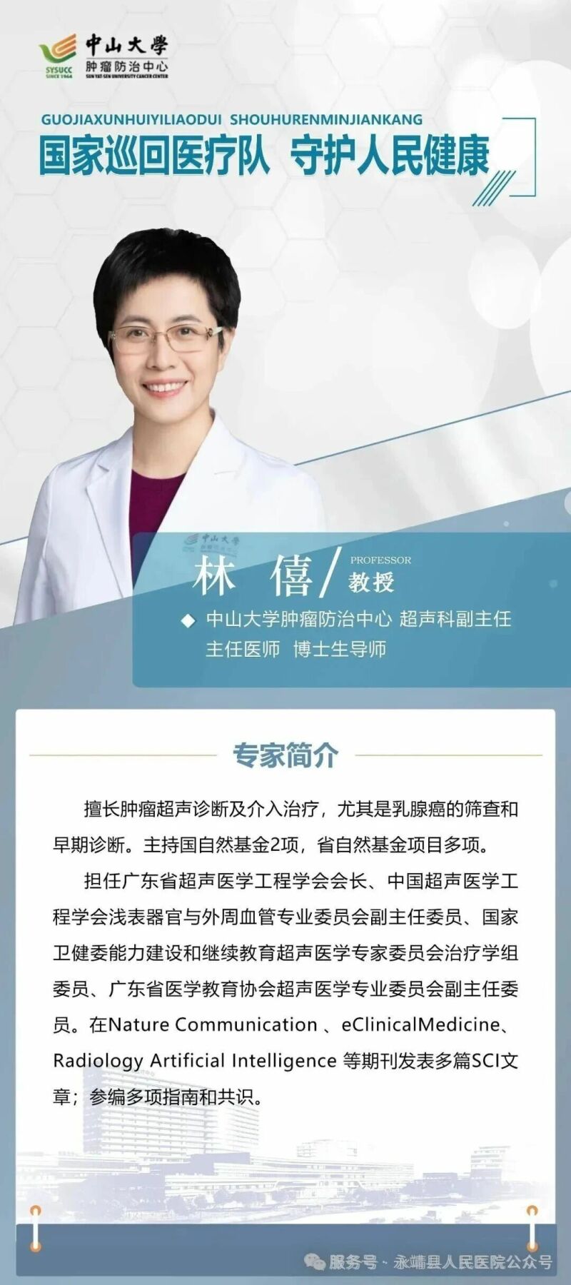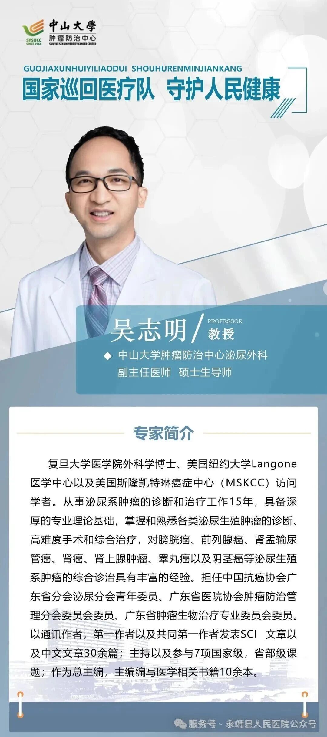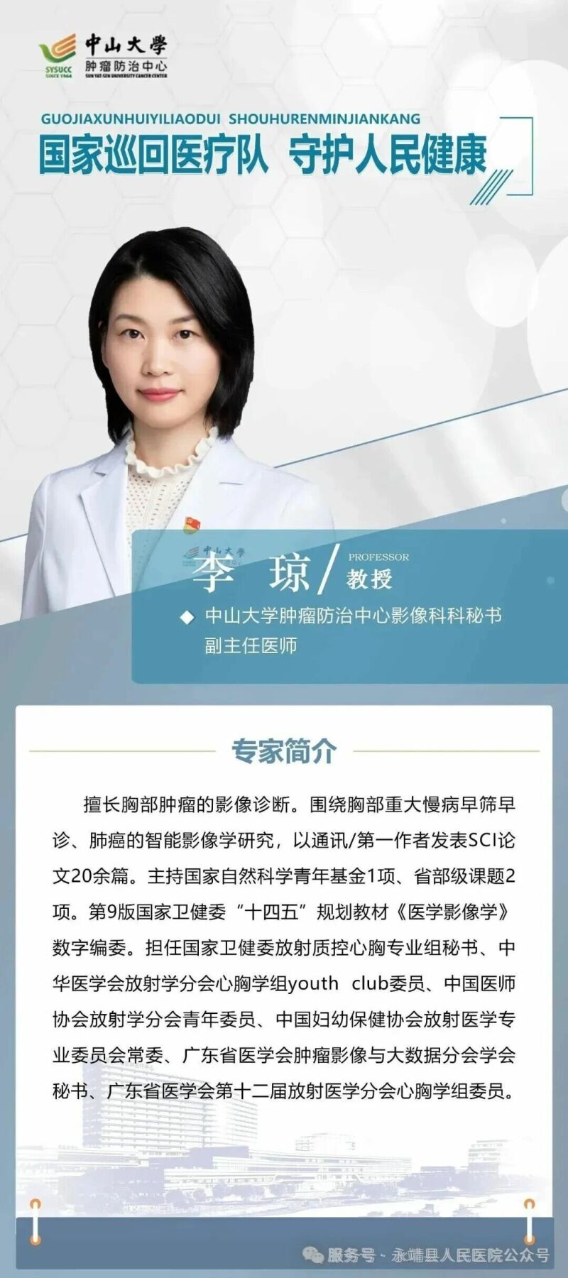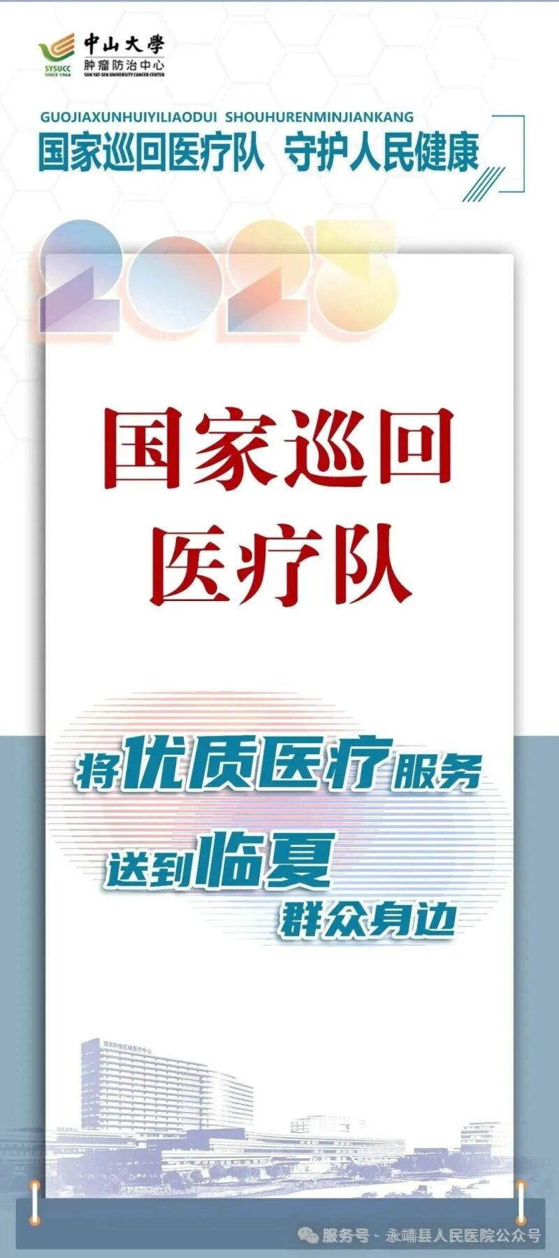 为切实推动优质医疗资源向基层延伸,让县域百姓无需远行,在家门口就能便捷享受到国内顶尖医疗服务,国家巡回医疗队中山大学肿瘤防治中心相关专家将于2025年10月20日到永靖县人民医院开展义诊、教学查房、业务培训及技术指导等活动。