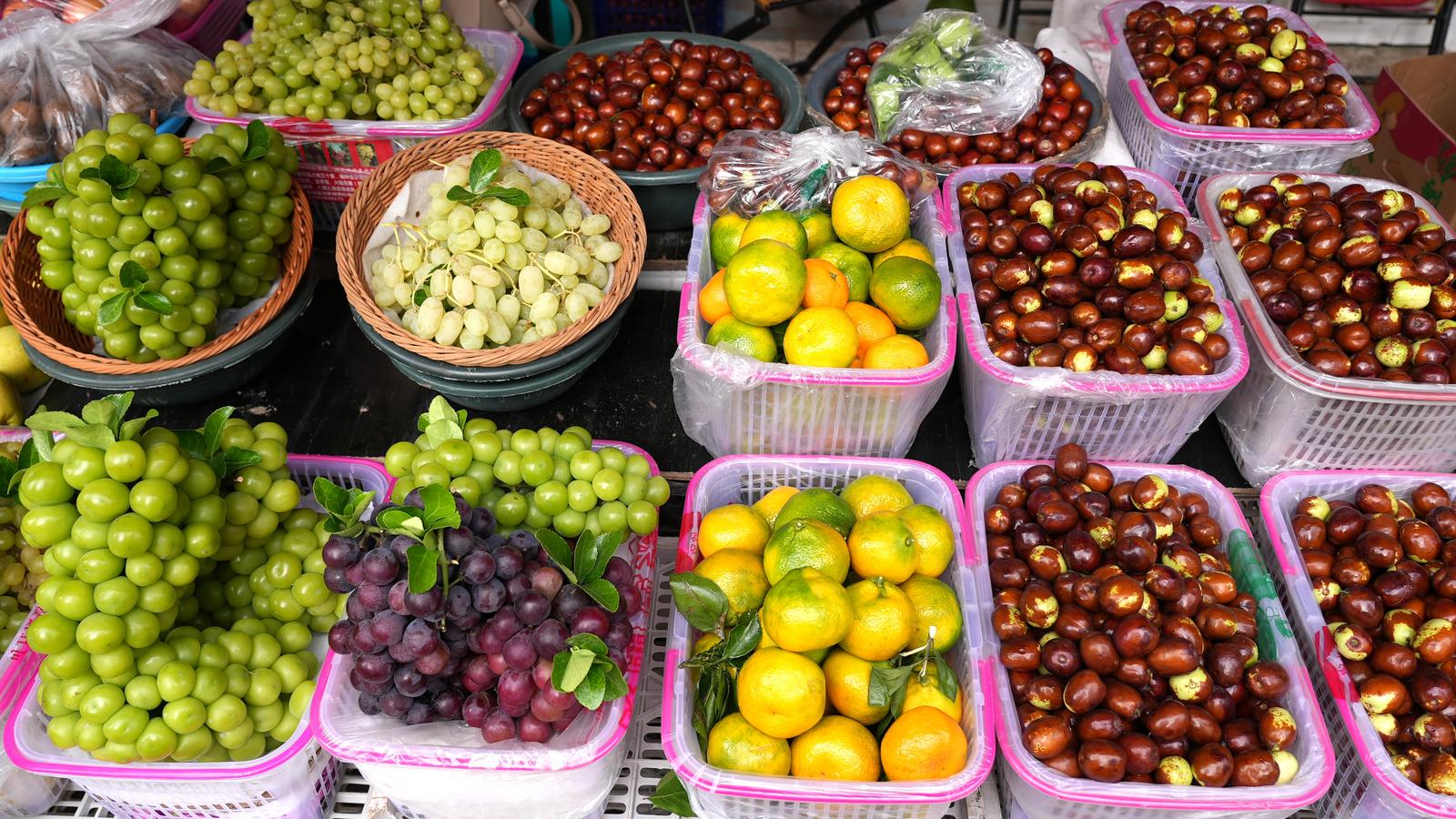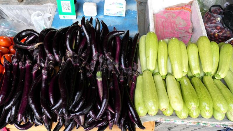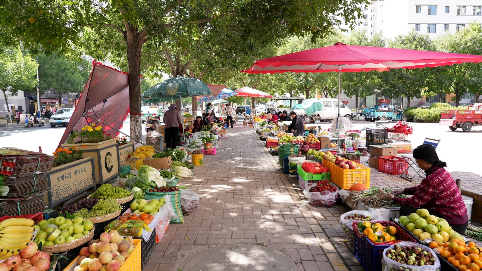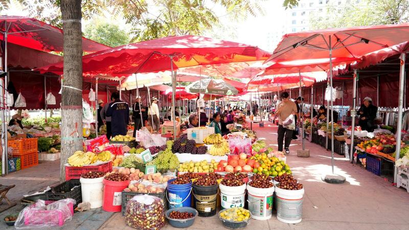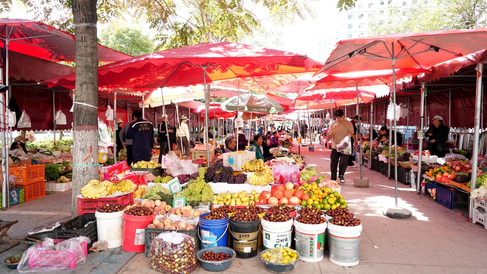 市场内,新鲜的蔬菜水果琳琅满目,紫得发亮的茄子码成小山,红彤彤的西红柿透着光泽,翠绿的葡萄圆润饱满,红彤彤的枣子脆嫩香甜。这些带着泥土气息的蔬果,不仅装满了市民的菜篮子,更把自然的生机与市井的温情,妥妥地揉进了平凡的日子里。