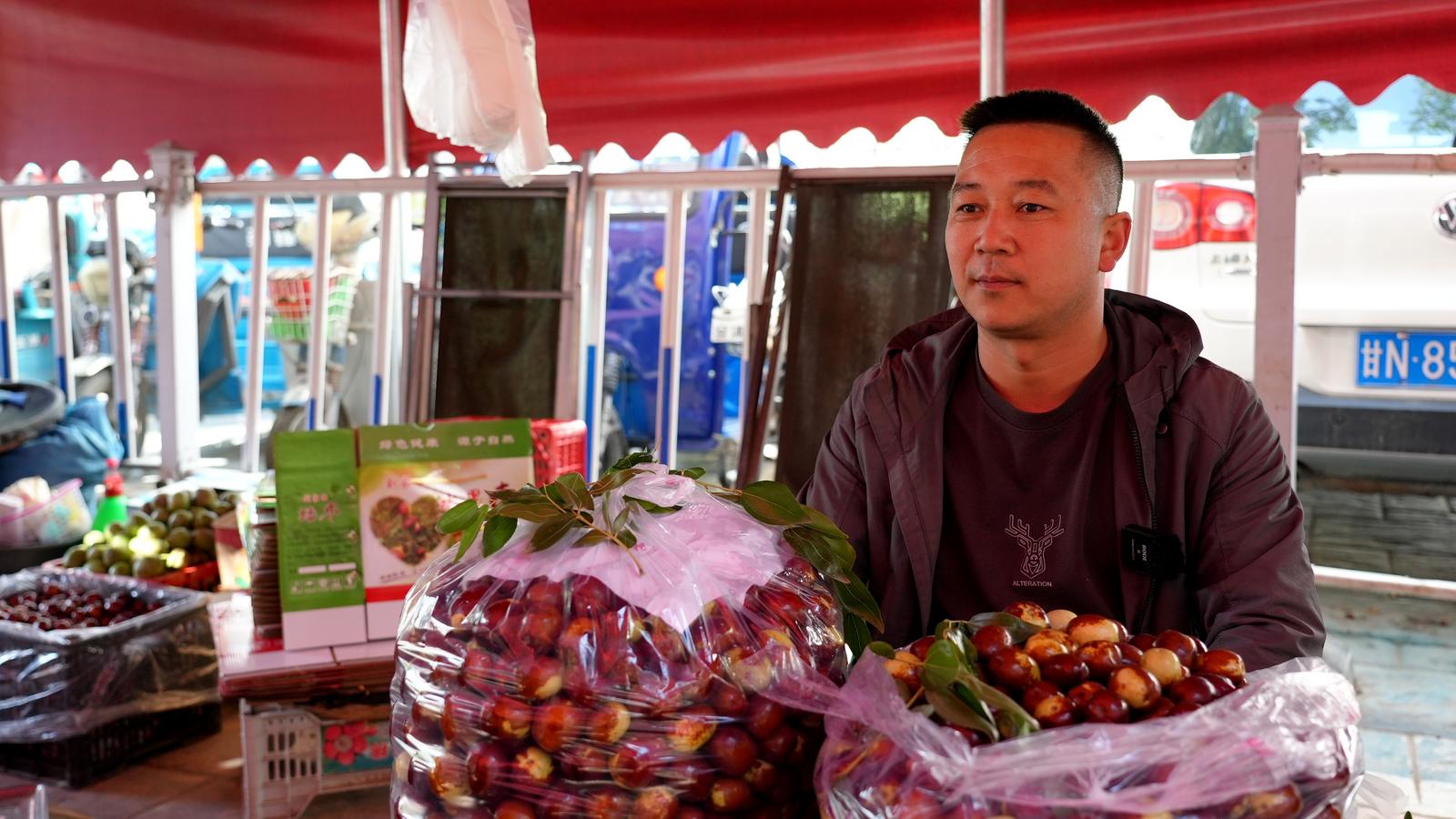 商户 尤俊龙 我的摊位上的葡萄和枣是自家园子的,为了顾客每天吃上更新鲜的枣和葡萄,我每天早上6点戴着头灯采摘,每天的生意也挺好的。
