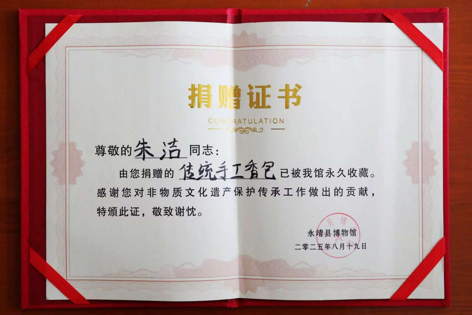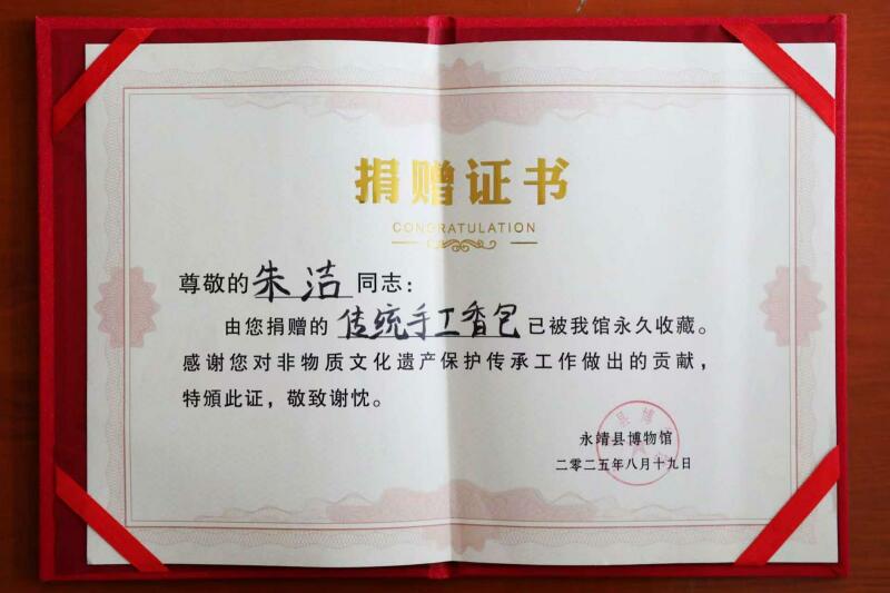 8月25日,市民朱洁将珍藏的90余件手工香包捐赠给永靖县博物馆收藏展示,丰富公共文化资源,促进传统文化的社会共享与传播。