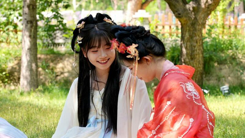 身着华丽汉服的爱好者们在“霓裳枣园”汉服巡游活动中成为园区一道亮丽风景线。他们穿梭于枣林间,或轻盈漫步,或优雅走秀,举手投足间尽显古典韵味。园区还贴心提供COS服体验租赁与简易妆造服务,让更多游客能够沉浸式感受汉服文化魅力,仿佛穿越回古代。