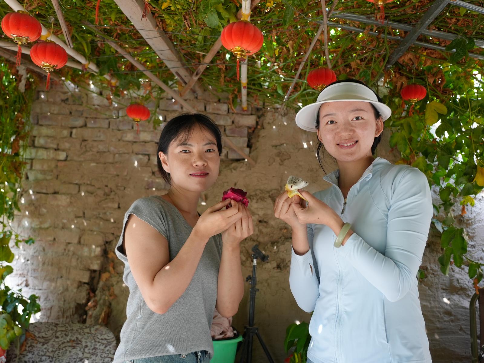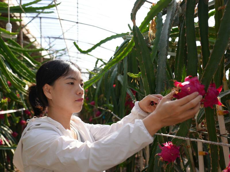 8月20日上午,记者走进岘塬镇光辉村火龙果基地种植大棚,一颗颗红彤彤的火龙果掩映在粗壮的青藤枝条之间,色泽鲜艳、果形饱满。技术员张宇欣穿梭其间,用剪刀剪摘下一颗颗已经红透了的火龙果装进篮子里。