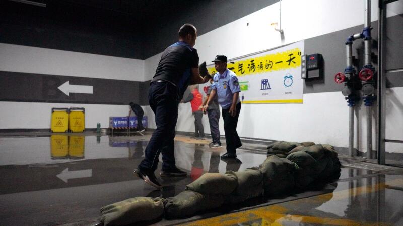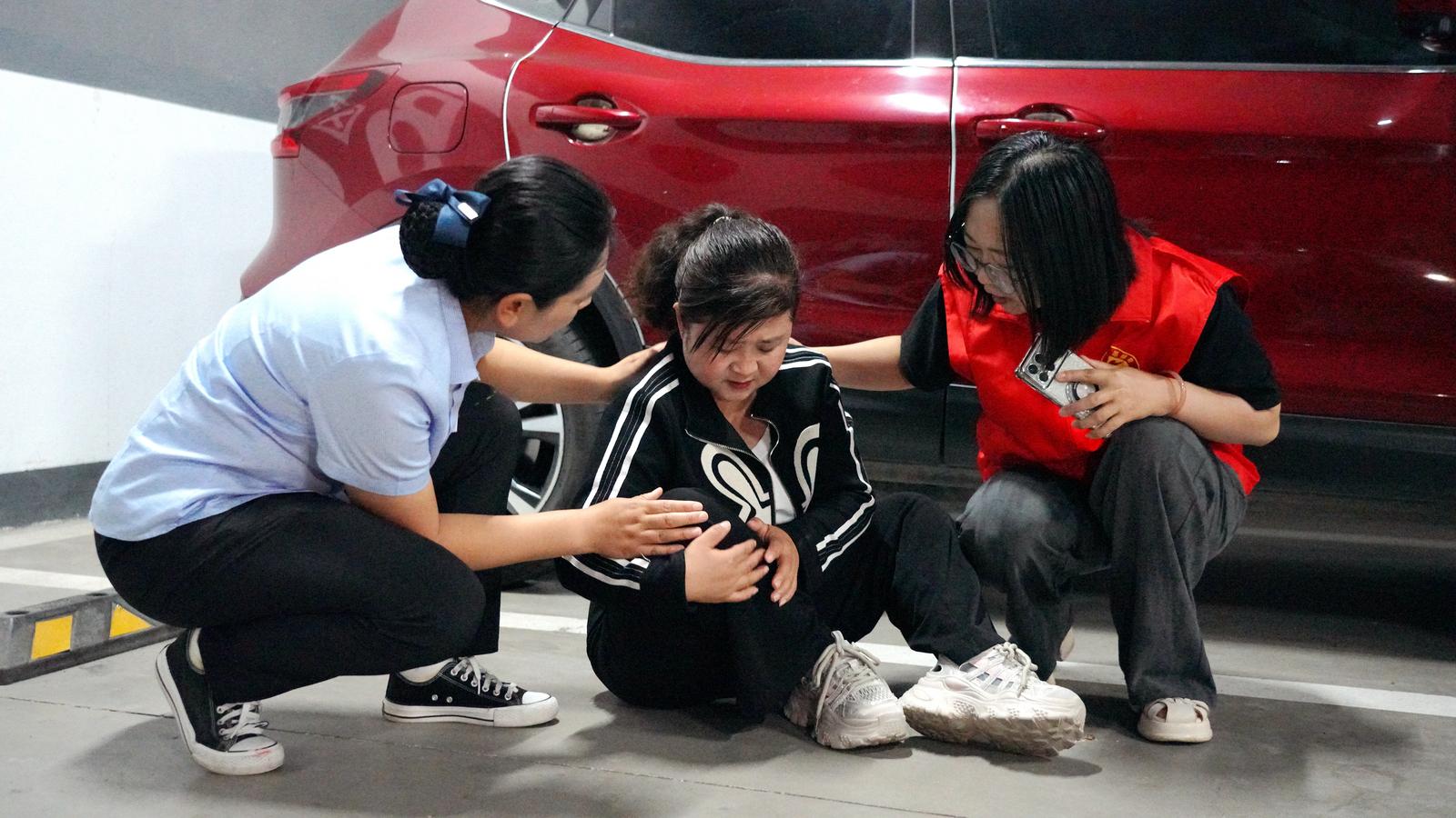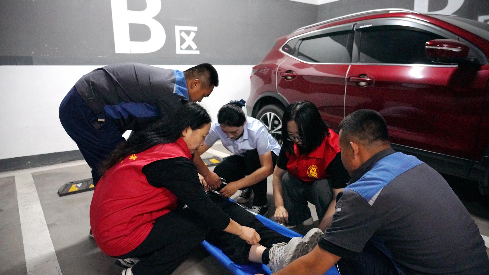 安全保卫组第一时间在车库口拉起警戒带,组织居民和车辆按预定路线向应急避难场所疏散,确保无遗漏并完成清点。应急救援组同步行动,一方面组织人员对地下车库堆放沙袋防积水蔓延,使用抽水泵和扫帚清理积水;另一方面由4名救援人员及社区工作人员组成担架队,模拟搜救转移被困人员。医疗救护组在避难场所设立临时医疗点,对“受伤人员”进行紧急救治与转运。后勤保障组则全程保障防汛沙袋、水泵、急救药品等物资供应,确保水电、交通畅通。信息保障组则负责演练记录、防汛知识普及及信息传递,为演练高效推进提供支撑。