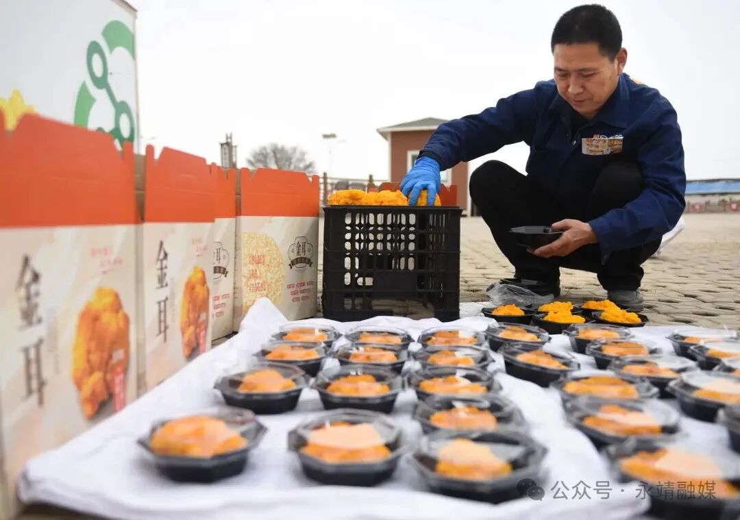 3月27日,在永靖县三塬镇下塬村“棚掌柜智慧云舱”内,一朵朵肥厚鲜嫩、饱满成熟的金耳丰收在望,工人正忙着采摘、打包、装箱,供应市场。