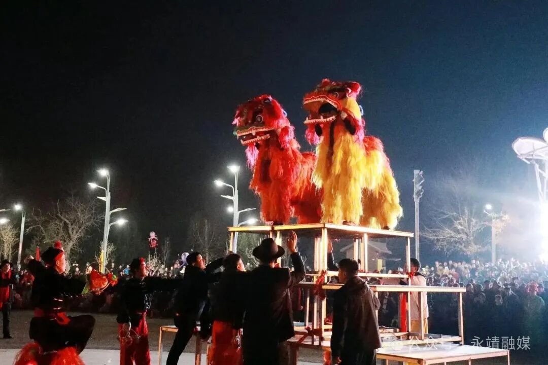 千人方阵展非遗。2月22日18时,由太傅、太平鼓、舞狮、旱船等方阵组成的社火队整装待发。太平鼓方阵率先登场,鼓手们脚踏"十字步",鼓槌翻飞如星,铿锵节奏与铜锣声交织。旱船表演中,"渔家女"手持船桨轻点地面,"艄公"则夸张划桨,配合《永靖船歌》的悠扬旋律,再现黄河渡口的劳动场景。舞狮队的"双狮戏珠"将传统武术与现代街舞结合,金狮腾跃翻滚,银狮吐纳祥瑞,赢得满场掌声。