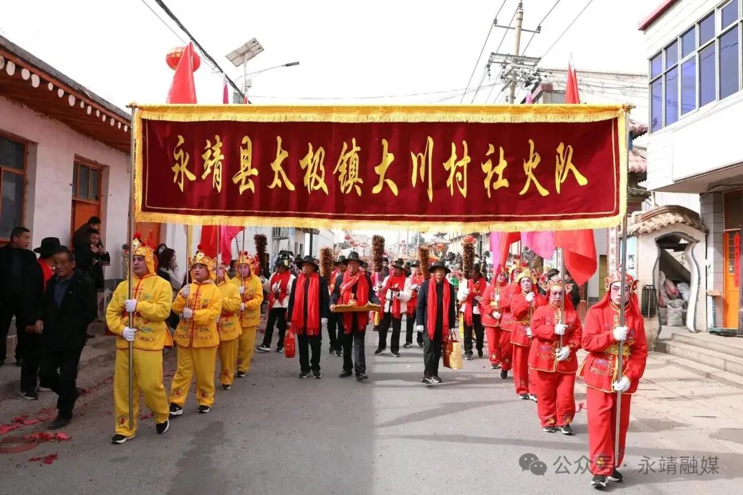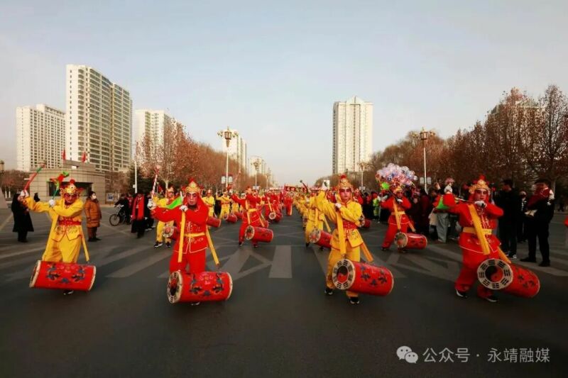 2026年2月22日(农历正月初六),永靖县彩陶广场鼓声震天、彩绸飞舞,太极镇大川村组成的社火队进城展演,以原汁原味的非遗表演为市民送上新春祝福,再现"黄河文化活化石"的千年魅力。