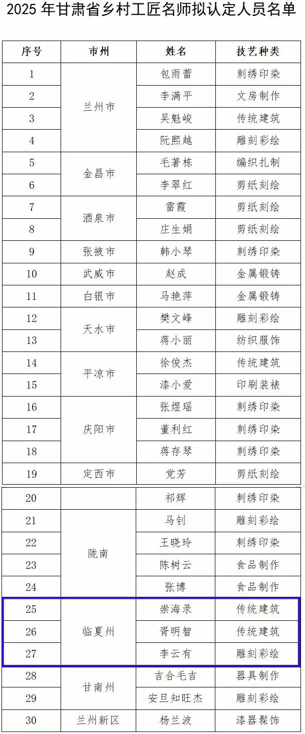 根据《关于推进乡村工匠培育工作的实施方案》(甘乡振局发〔2023〕15号)精神,经个人申请、市县推荐,省农业农村厅、省教育厅、省工信厅、省人社厅、省住建厅、省文旅厅、省妇联共同研究确定了2025年度乡村工匠名师名单。现按要求予以公示。公示期为11月5日至11月11日。
